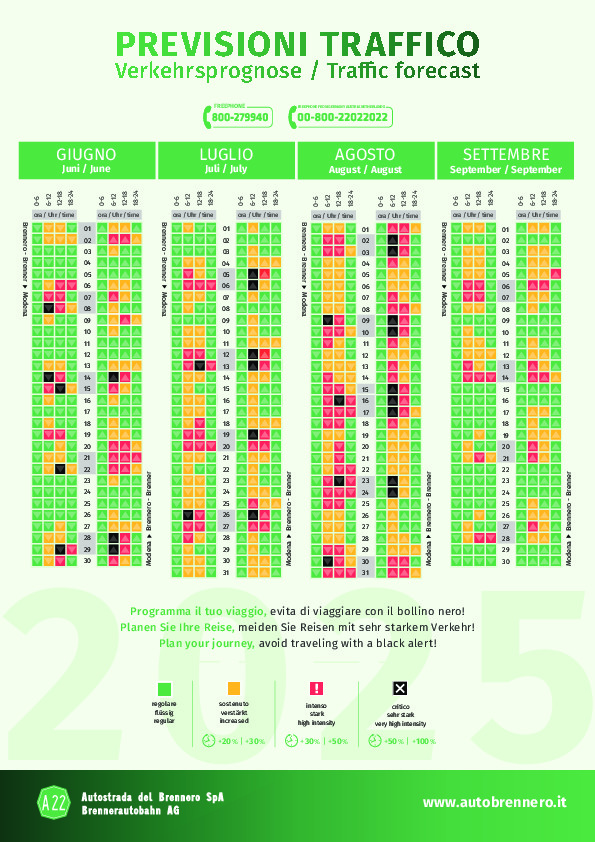 Sind Zeit- bzw. Streckenabschnitte gelb markiert, bedeutet dies einen Zeitverlust von 20 bis 30 Prozent. Rot kennzeichnet starken Verkehr mit 30 bis 50 Prozent Zeitverlust; schwarz sehr starken mit einem Zeitverlust bis zu 100 Prozent.Engpässe sind an den Mautstellen Sterzing und Bozen Süd sowie auf dem Abschnitt zwischen Brixen und dem Pustertal zu erwarten.